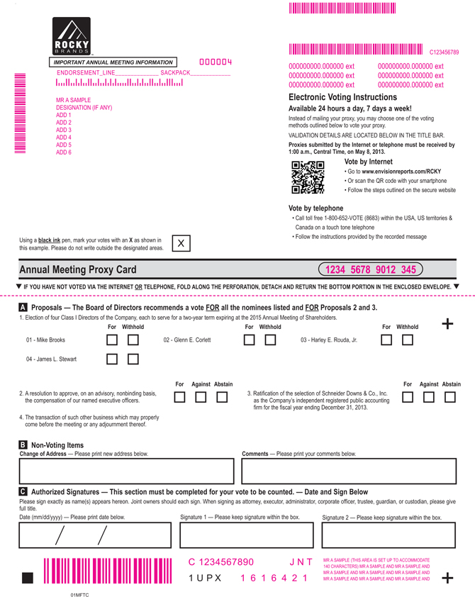 You will be most welcome at the meeting, and we hope you can attend. Shareholders may obtain directions to the annual meeting by visiting the Company’s website: www.rockybrands.com. Directors and officers of the Company and representatives of its independent registered public accounting firm will be present to answer your questions and to discuss its business.