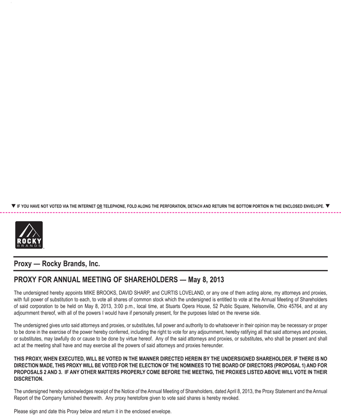 I am pleased to invite you to the Annual Meeting of Shareholders of Rocky Brands, Inc. to be held on Wednesday, May 8, 2013, at 3:00 p.m., at Stuarts Opera House, located at 52 Public Square, Nelsonville, Ohio. Parking is available in Nelsonville at Rocky Brands, Inc., at 39 East Canal Street. We look forward to meeting all of our shareholders who are able to attend.