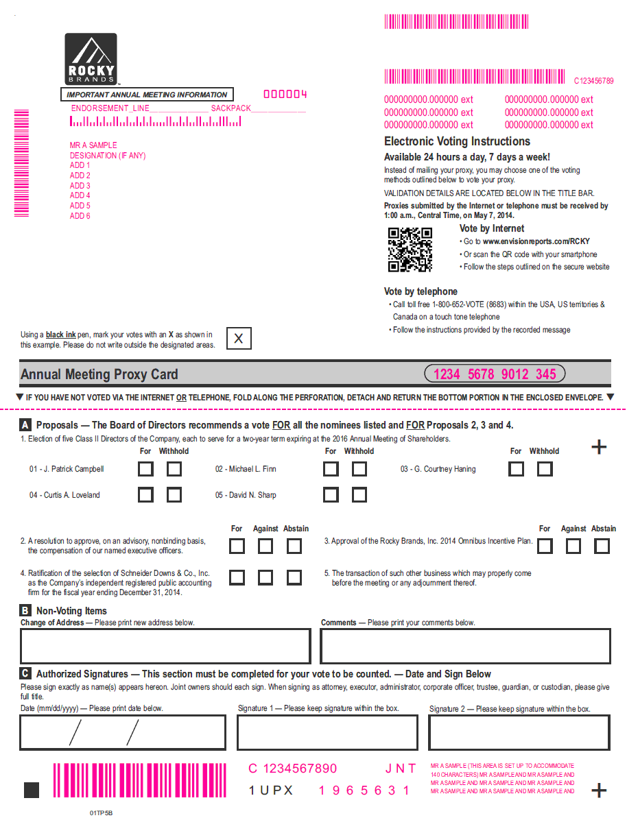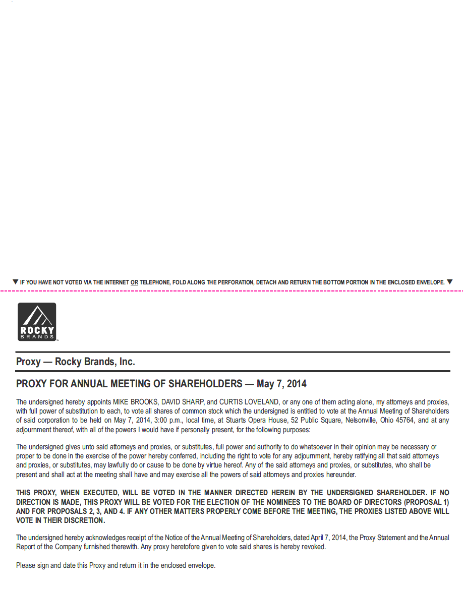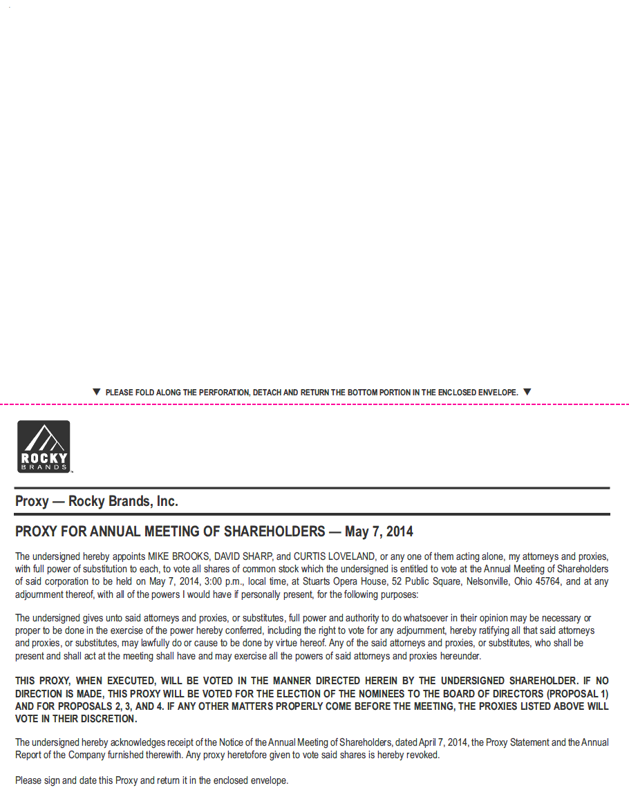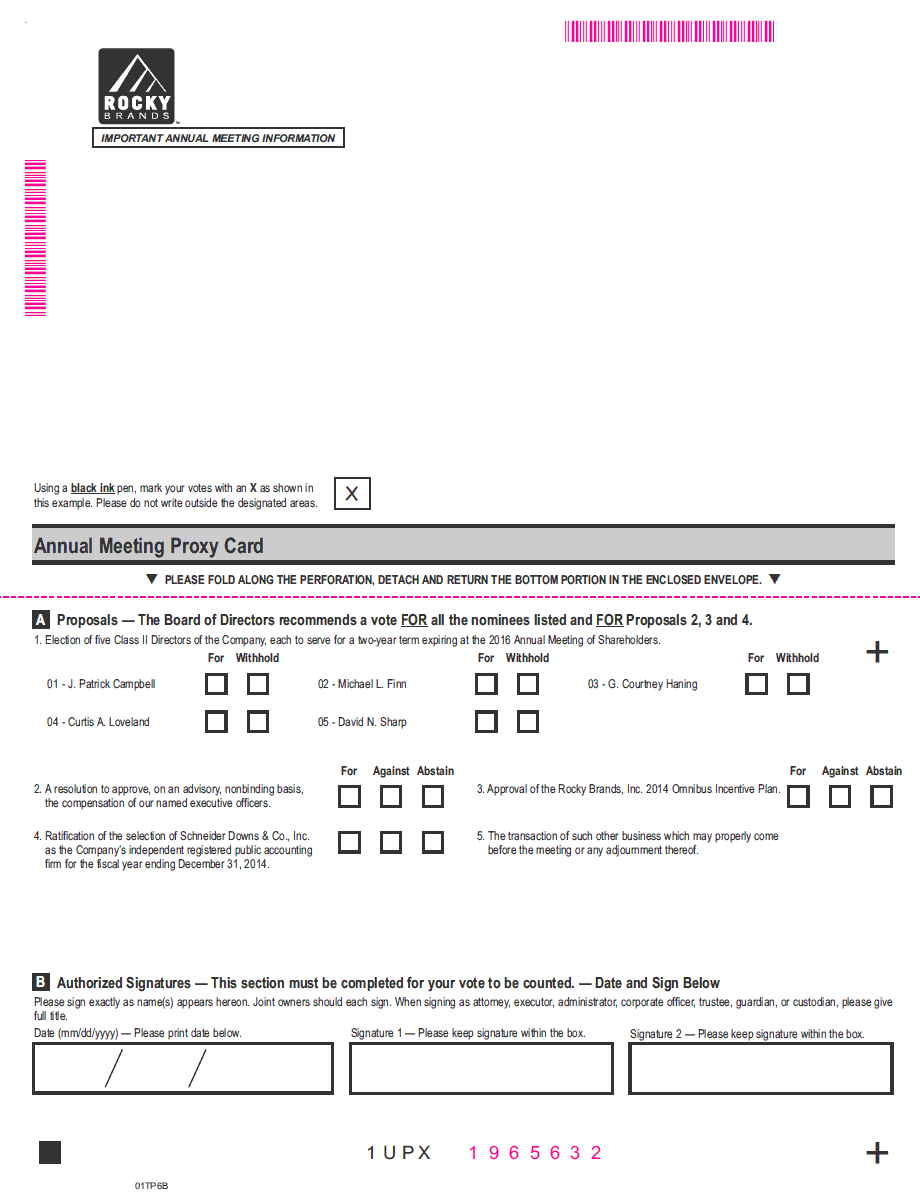 At the annual meeting, you will be asked to (i) elect J. Patrick Campbell, Michael L. Finn, G. Courtney Haning, Curtis A. Loveland, and David N. Sharp for two-year terms as Class II Directors, (ii) approve, on an advisory nonbinding basis, the compensation of our named executive officers; (iii) approve the Rocky Brands, Inc. 2014 Omnibus Incentive Plan; (iv) ratify the selection of Schneider Downs & Co., Inc. as the Company’s independent registered public accounting firm for the fiscal year ending December 31, 2014, and (v) transact any other business which may properly come before the meeting or any adjournment thereof. A copy of the proxy statement and the proxy card are enclosed.