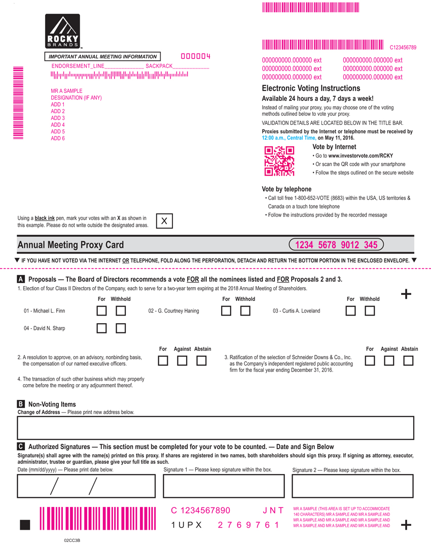 Important Notice Regarding the Availability of Proxy Materials for the Shareholder Meeting to be Held on May 11, 2016: The proxy statement and annual report to security holders are available at www.edocumentview.com/RCKY.