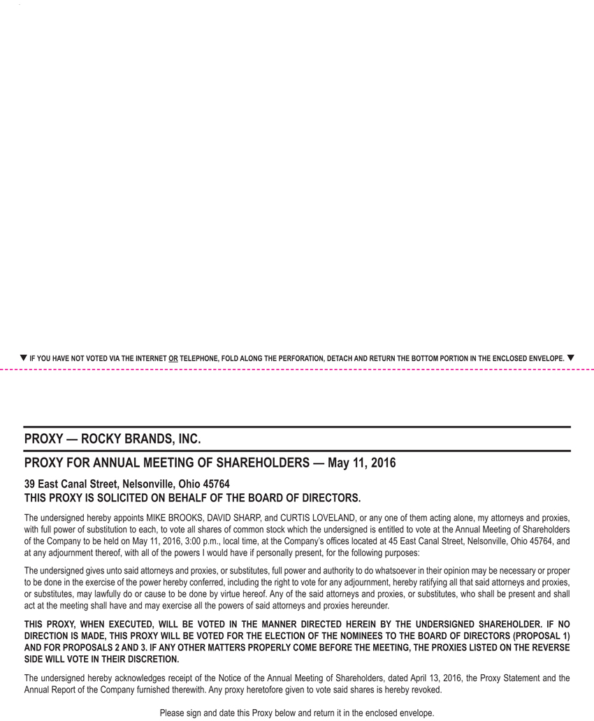 I am pleased to invite you to the Annual Meeting of Shareholders of Rocky Brands, Inc. to be held on Wednesday, May 11, 2016, at 3:00 p.m., at the Company’s offices located at 45 East Canal Street, Nelsonville, Ohio. We look forward to meeting all of our shareholders who are able to attend.