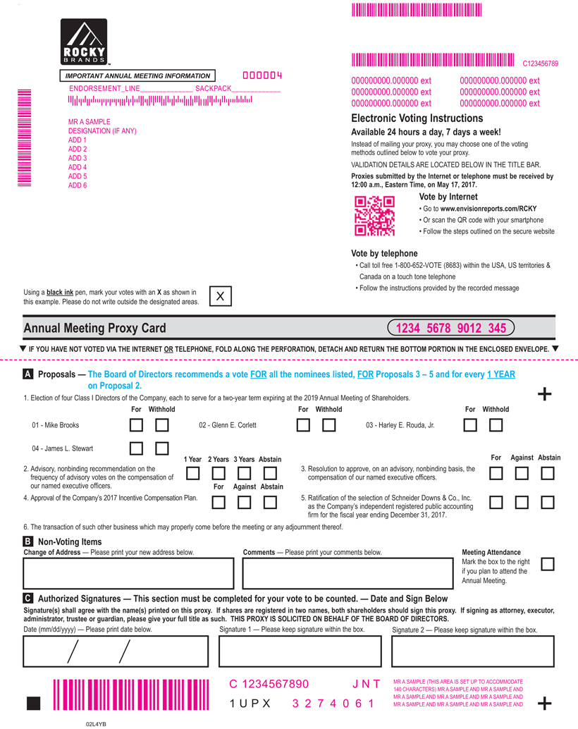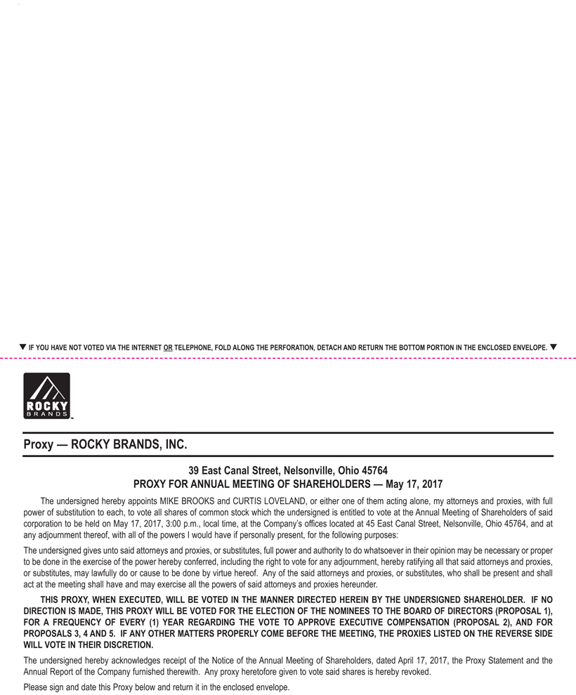 IF YOU HAVE NOT VOTED VIA THE INTERNET OR TELEPHONE, FOLD ALONG THE PERFORATION, DETACH AND RETURN THE BOTTOM PORTION IN THE ENCLOSED ENVELOPE. Proxy — ROCKY BRANDS, INC. 39 East Canal Street, Nelsonville, Ohio 45764 PROXY FOR ANNUAL MEETING OF SHAREHOLDERS — May 17, 2017 The undersigned hereby appoints MIKE BROOKS and CURTIS LOVELAND, or either one of them acting alone, my attorneys and proxies, with full power of substitution to each, to vote all shares of common stock which the undersigned is entitled to vote at the Annual Meeting of Shareholders of said corporation to be held on May 17, 2017, 3:00 p.m., local time, at the Company’s offices located at 45 East Canal Street, Nelsonville, Ohio 45764, and at any adjournment thereof, with all of the powers I would have if personally present, for the following purposes: The undersigned gives unto said attorneys and proxies, or substitutes, full power and authority to do whatsoever in their opinion may be necessary or proper to be done in the exercise of the power hereby conferred, including the right to vote for any adjournment, hereby ratifying all that said attorneys and proxies, or substitutes, may lawfully do or cause to be done by virtue hereof. Any of the said attorneys and proxies, or substitutes, who shall be present and shall act at the meeting shall have and may exercise all the powers of said attorneys and proxies hereunder. THIS PROXY, WHEN EXECUTED, WILL BE VOTED IN THE MANNER DIRECTED HEREIN BY THE UNDERSIGNED SHAREHOLDER. IF NO DIRECTION IS MADE, THIS PROXY WILL BE VOTED FOR THE ELECTION OF THE NOMINEES TO THE BOARD OF DIRECTORS (PROPOSAL 1), FOR A FREQUENCY OF EVERY (1) YEAR REGARDING THE VOTE TO APPROVE EXECUTIVE COMPENSATION (PROPOSAL 2), AND FOR PROPOSALS 3, 4 AND 5. IF ANY OTHER MATTERS PROPERLY COME BEFORE THE MEETING, THE PROXIES LISTED ON THE REVERSE SIDE WILL VOTE IN THEIR DISCRETION. The undersigned hereby acknowledges receipt of the Notice of the Annual Meeting of Shareholders, dated April 17, 2017, the Proxy Statement and the Annual Report of the Company furnished therewith. Any proxy heretofore given to vote said shares is hereby revoked. Please sign and date this Proxy below and return it in the enclosed envelope.